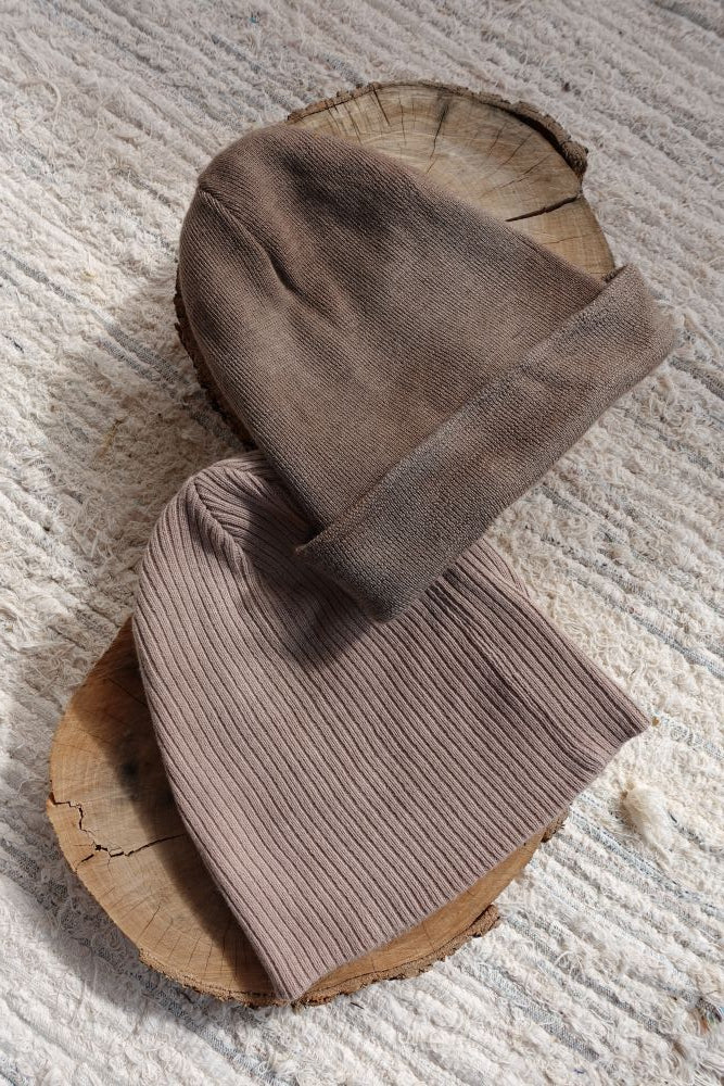 Disfrute del confort y la calidez de los gorros de algodón cuidadosamente estampados y teñidos a mano con elementos naturales.