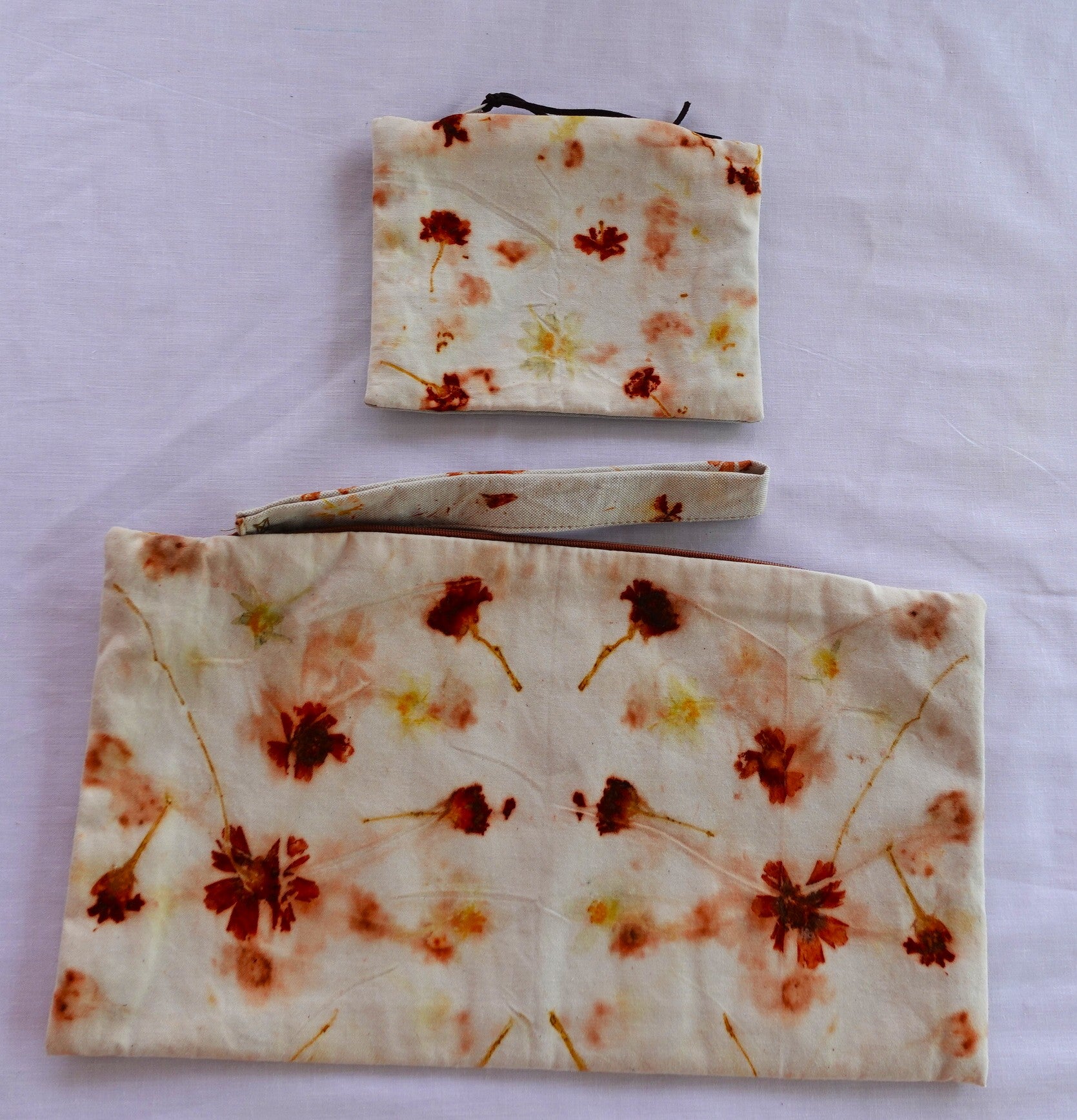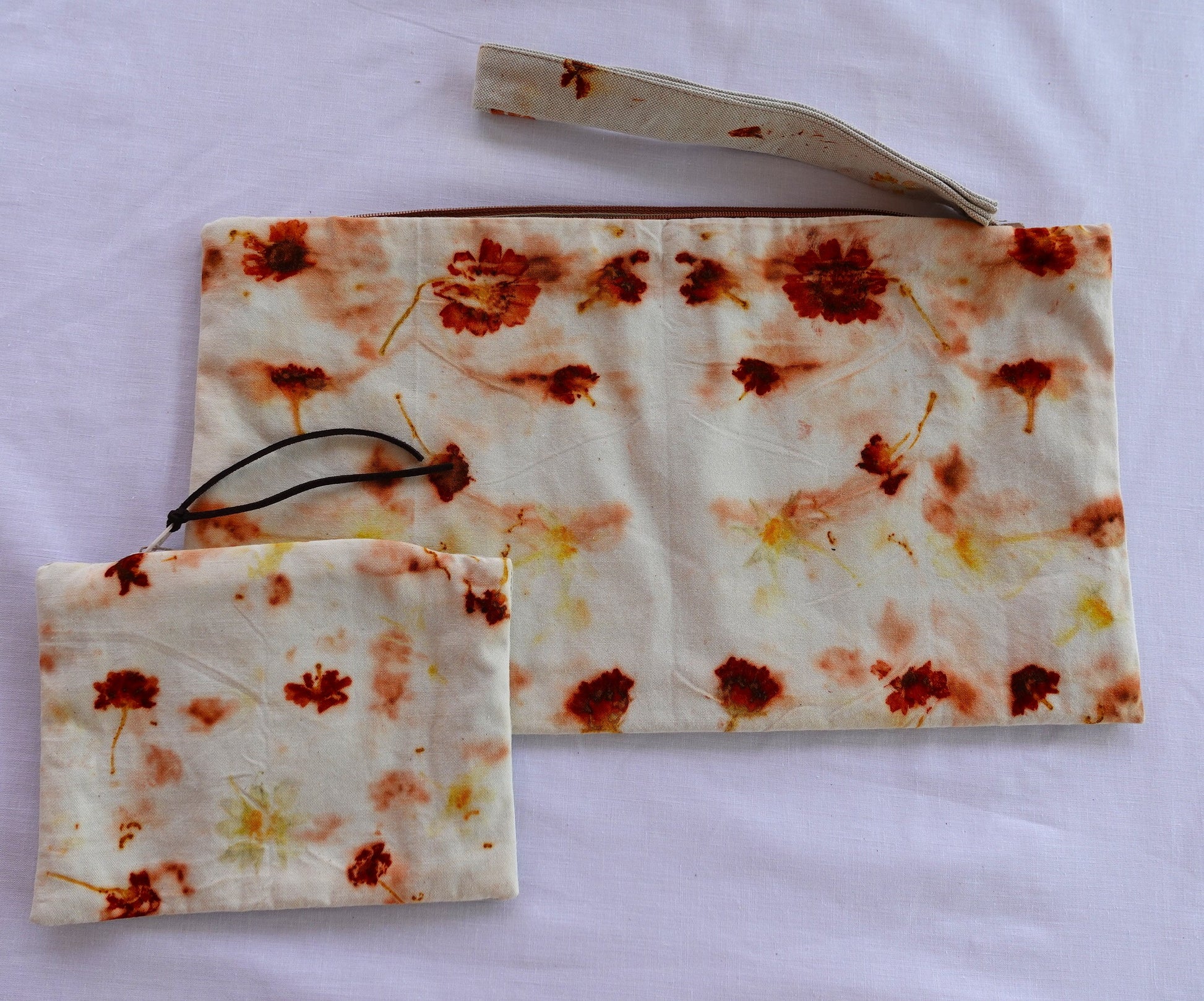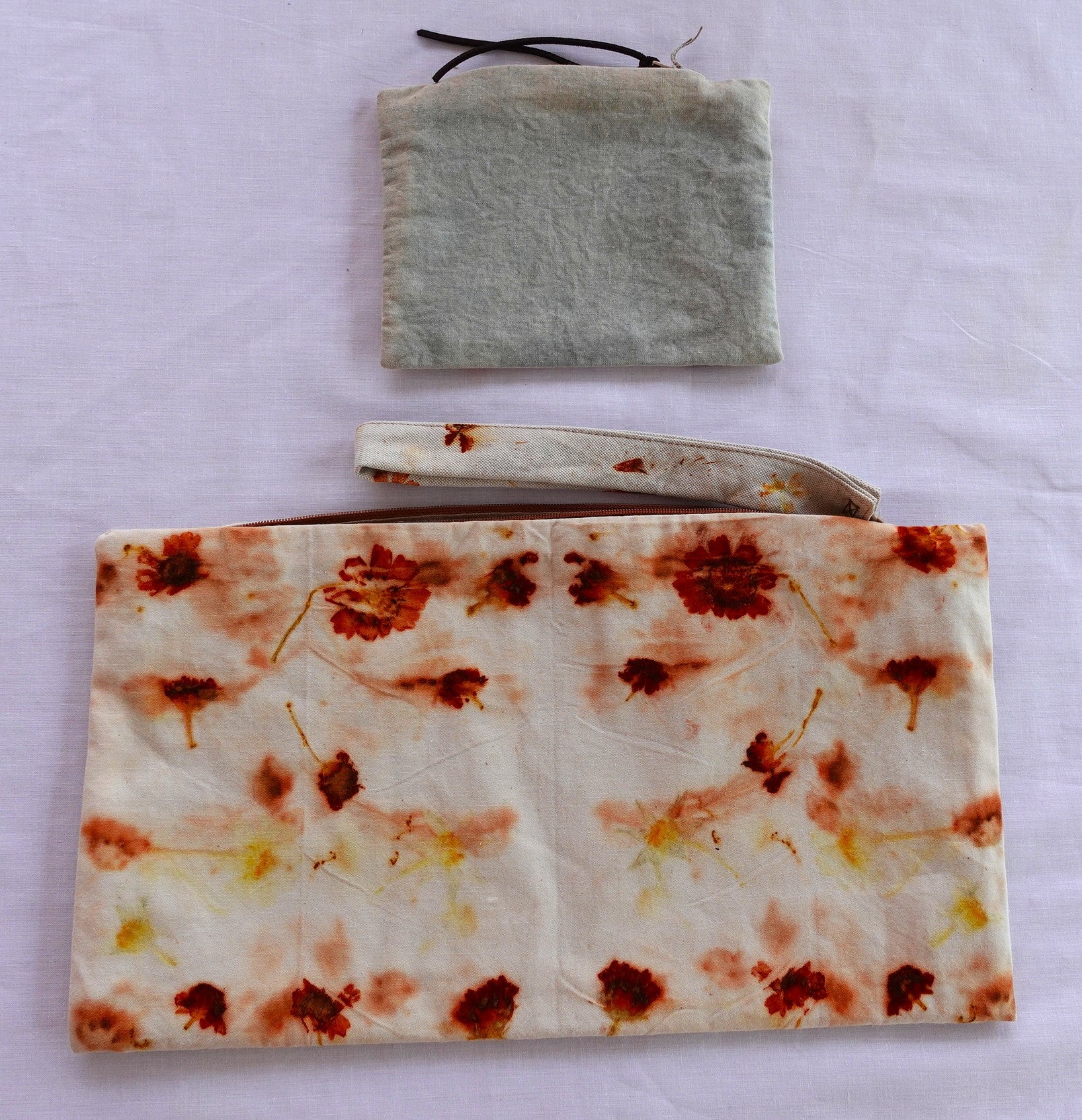 Estas piezas están confeccionadas con gran atención al detalle: teñidas individualmente con técnicas de Eco Print, cada bolsa es única por eso las medidas varían un poco.