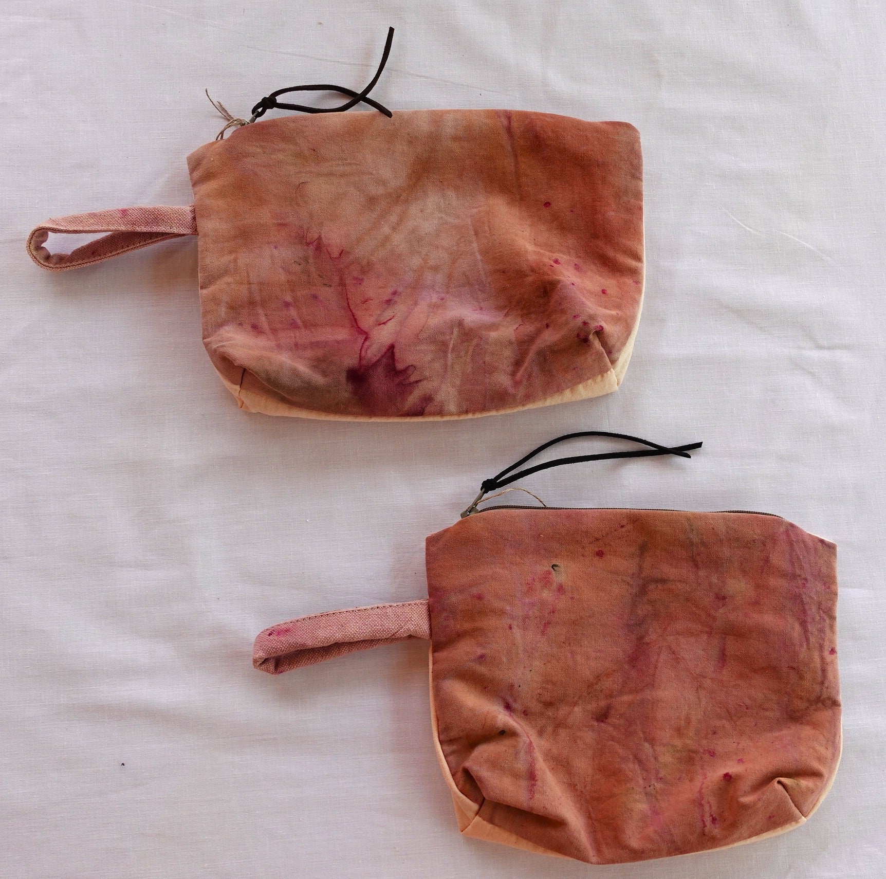 Estas piezas están confeccionadas con gran atención al detalle: teñidas individualmente con técnicas de Eco Print, cada bolsa es única por eso las medidas varían un poco.
