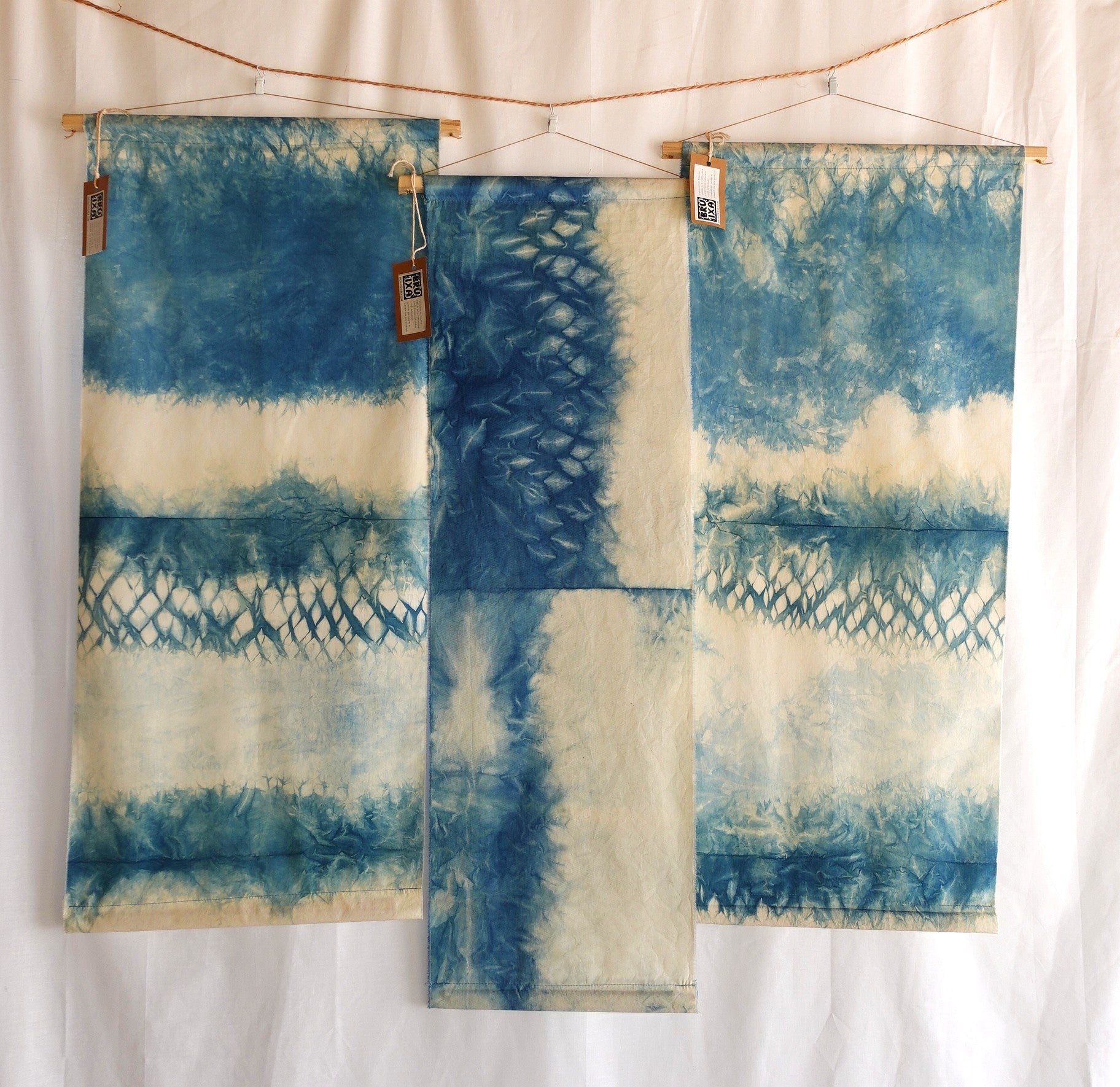 La colección de arte textil "Tanit" está inspirada en las aguas del Mediterráneo de la isla de Ibiza. Fibras 100% naturales teñidas con índigo.