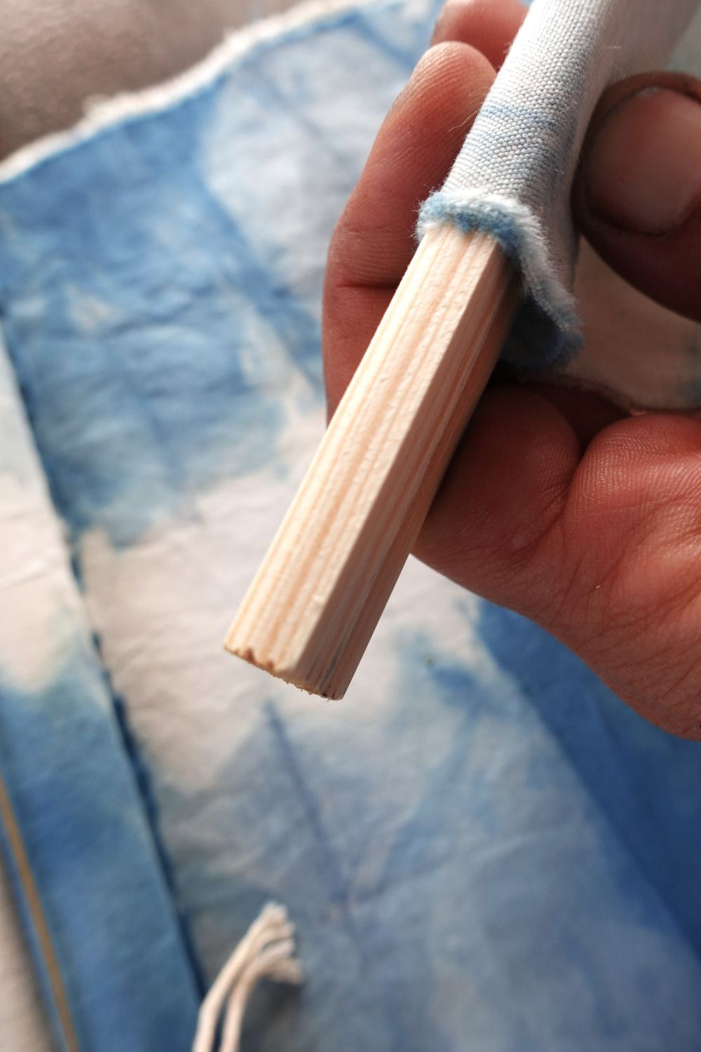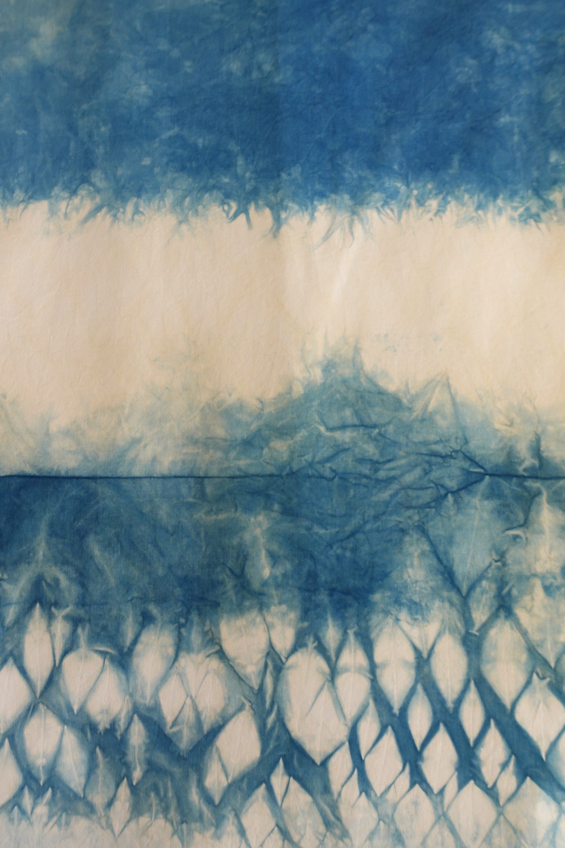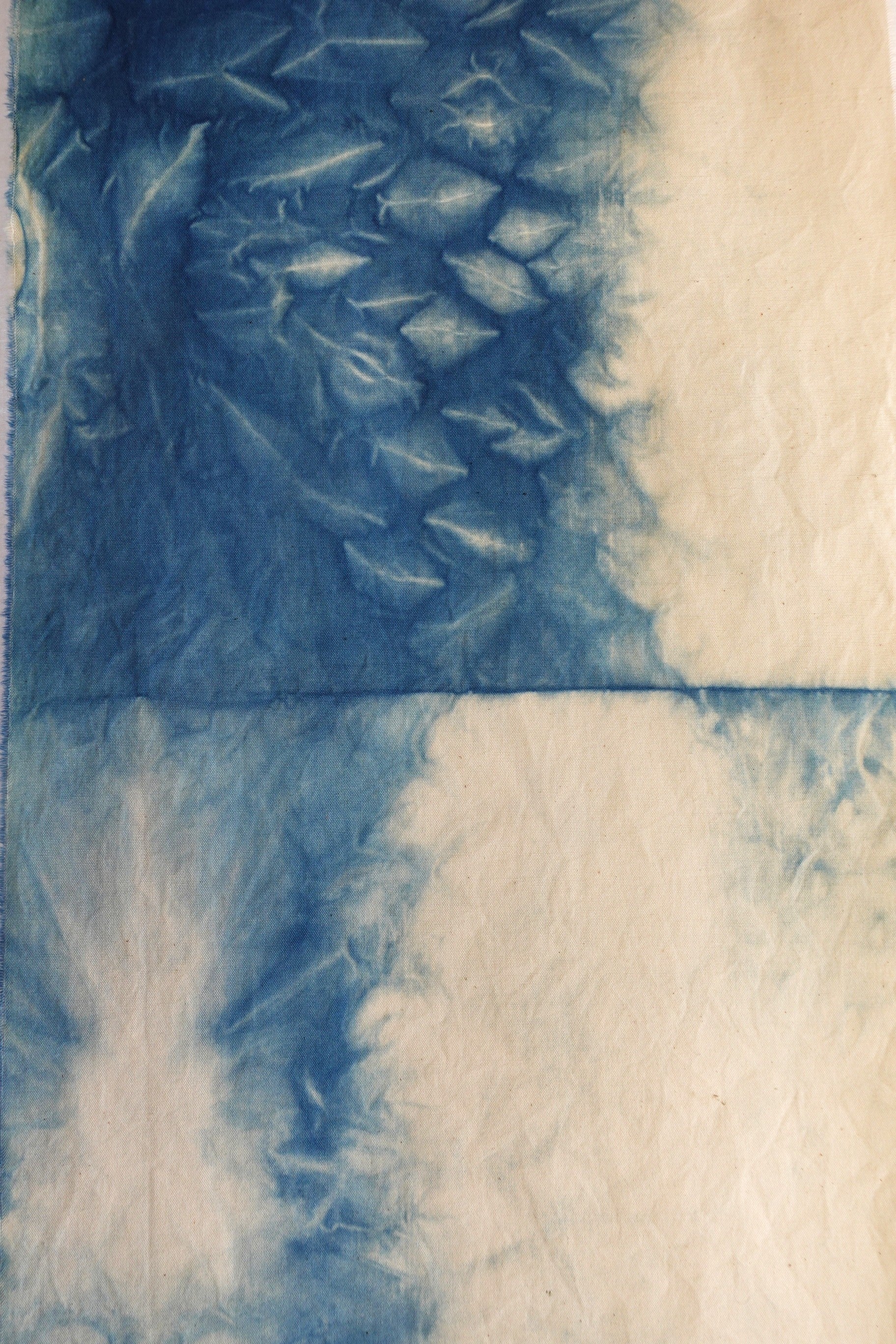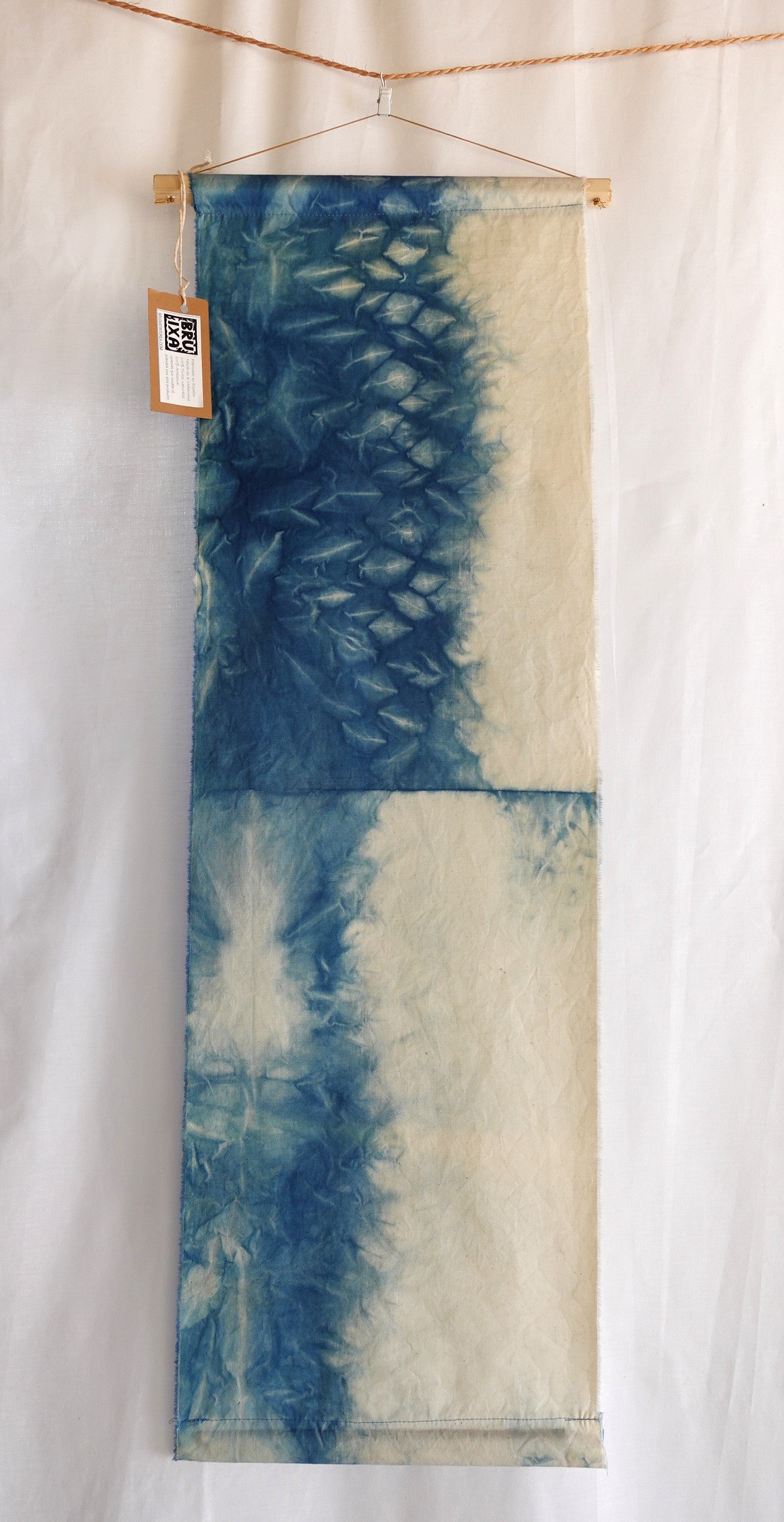 Cada pieza es única ya que está teñida a mano formando patrones irrepetibles. El proceso del tratamiento con índigo de Bruixa Tintórea es 100% natural y sostenible. La técnica usada no lleva químicos, respetando el proceso y tiempos naturales de la planta de índigo (indigofera)