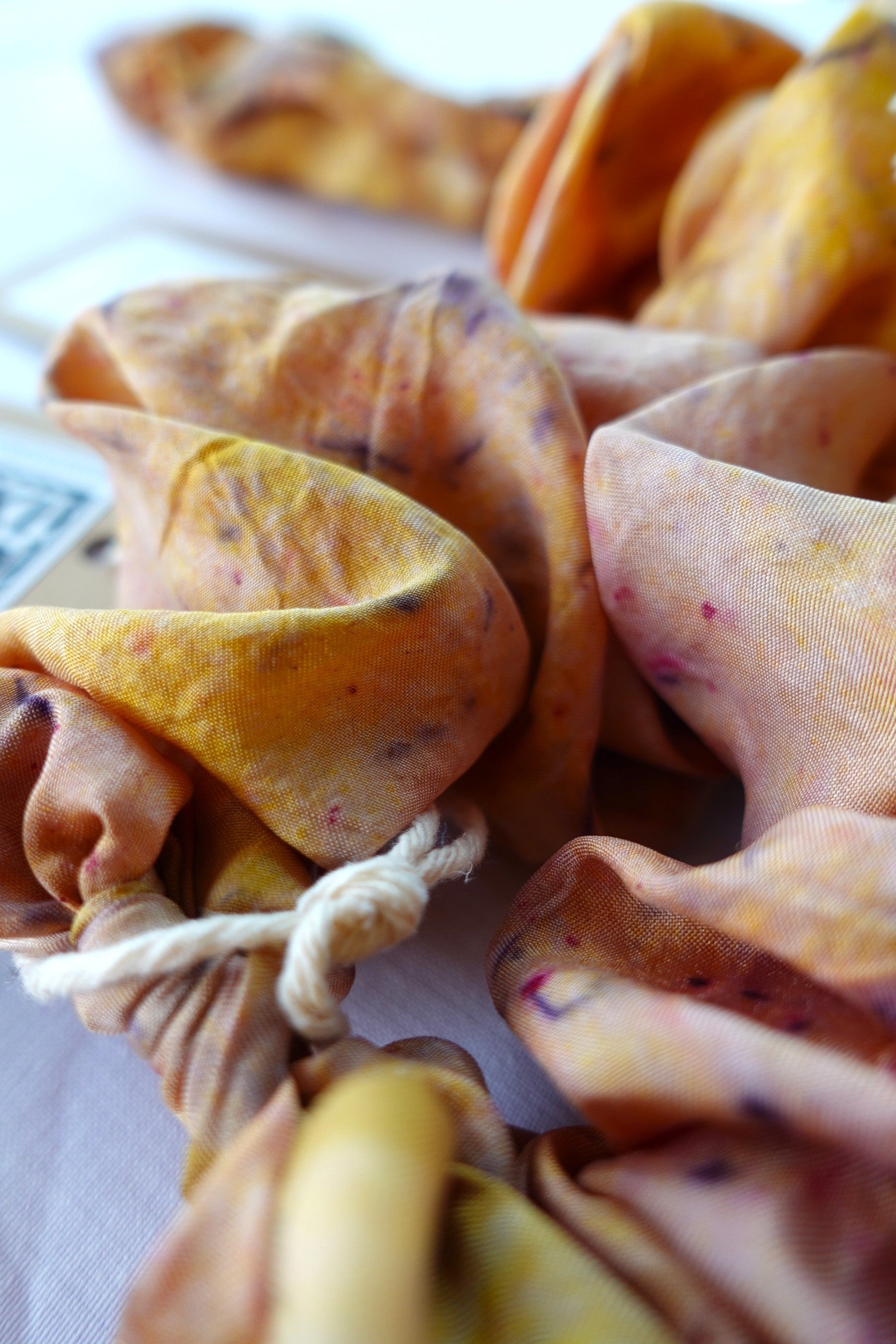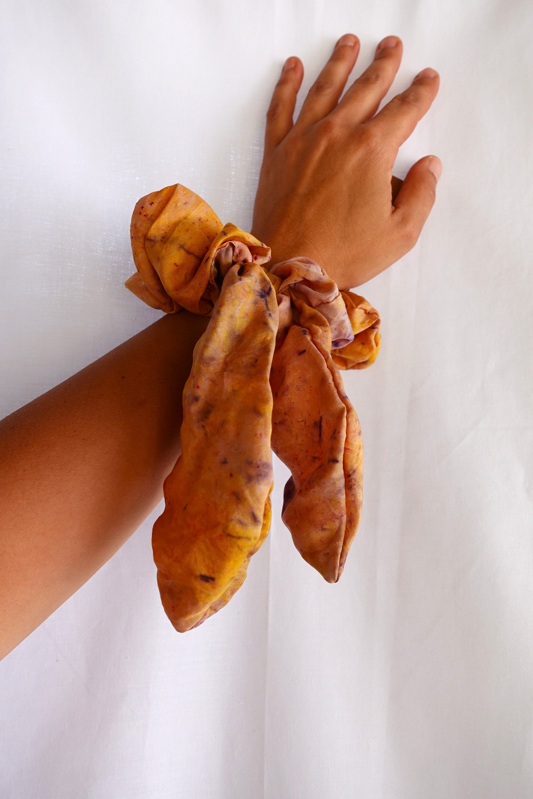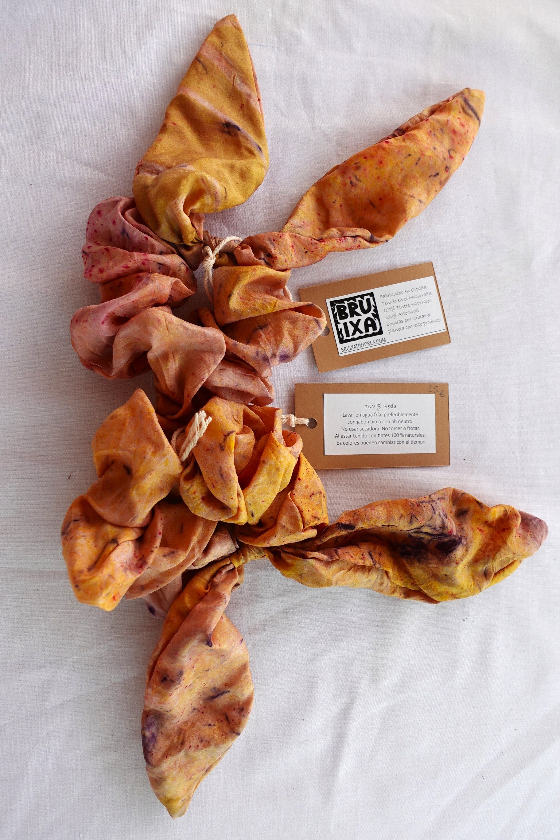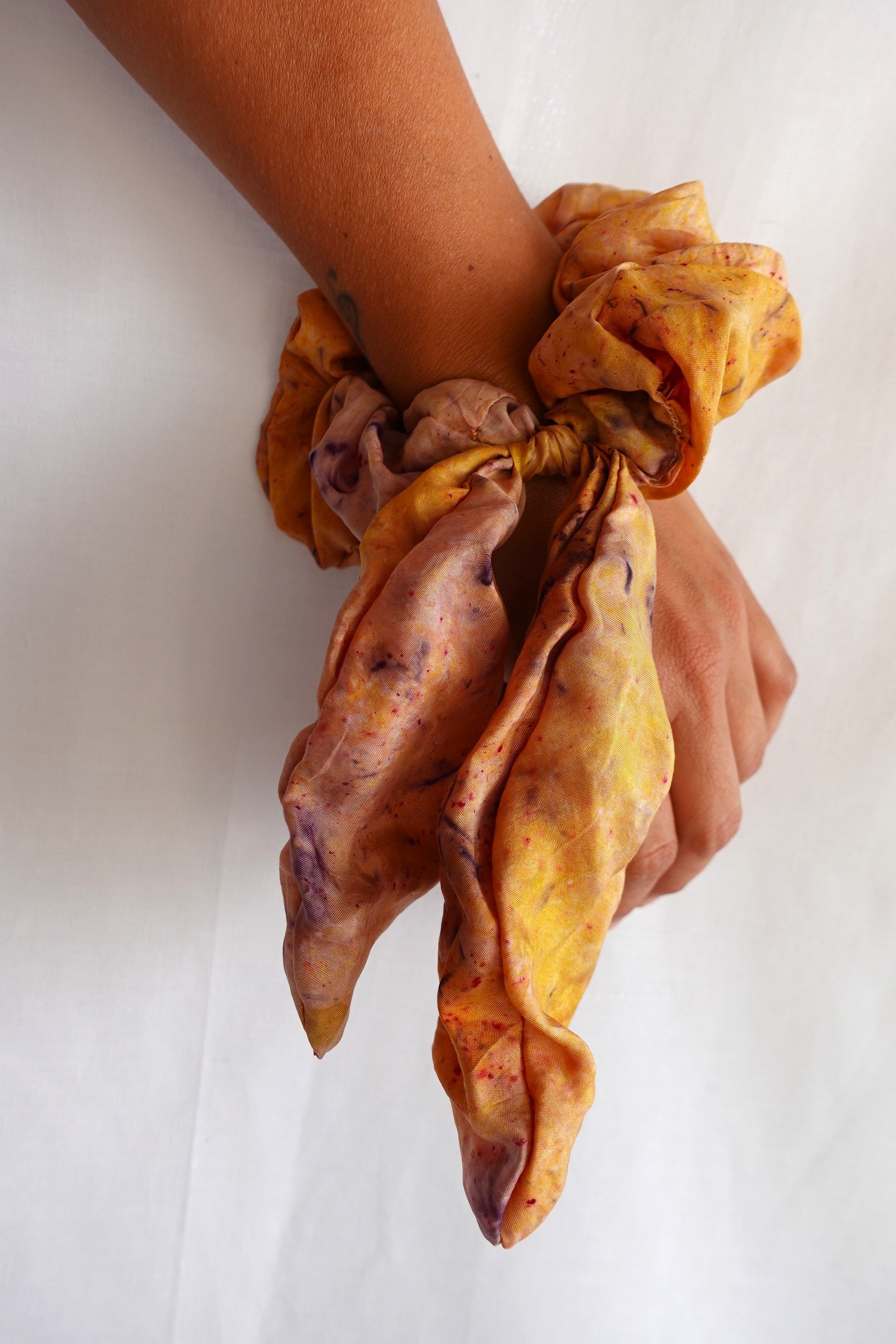 Este scrunchie para el cabello combina la suavidad y elegancia de la seda de alta calidad con la autenticidad del teñido y la costura artesanal.