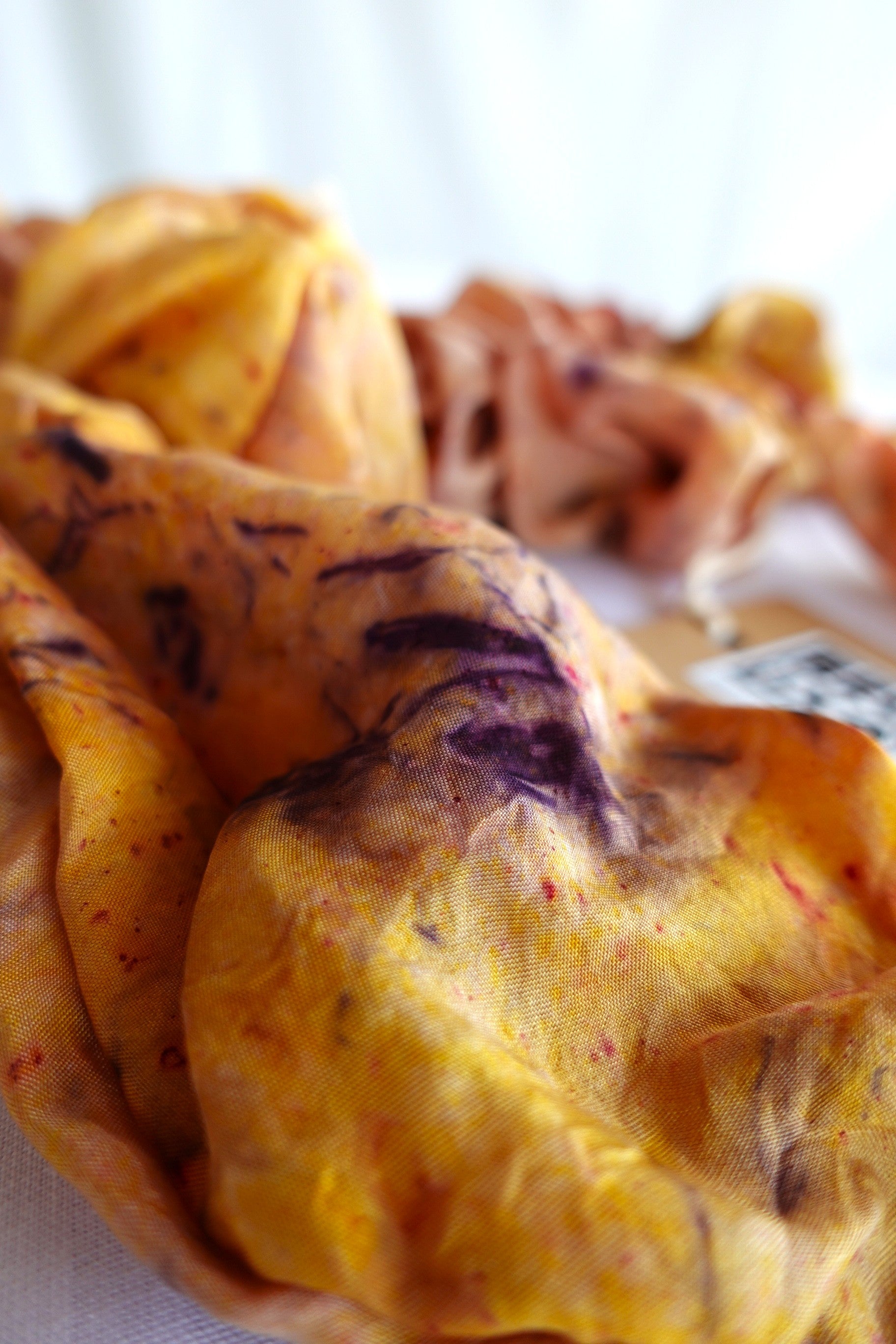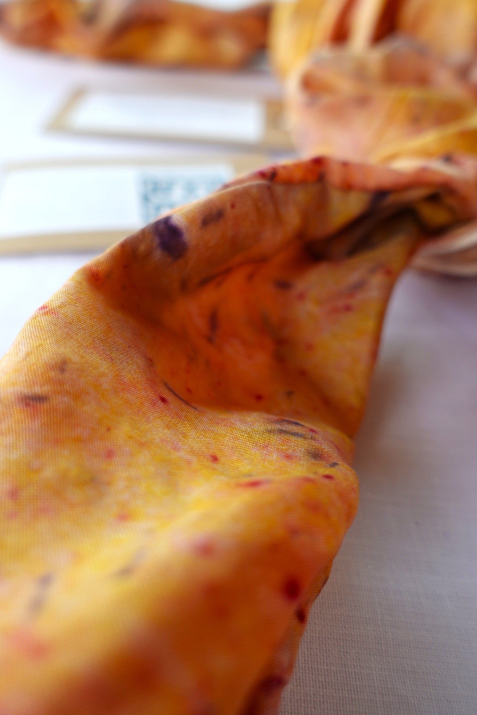 - Técnica: Teñido a mano con elementos naturales (eco print)