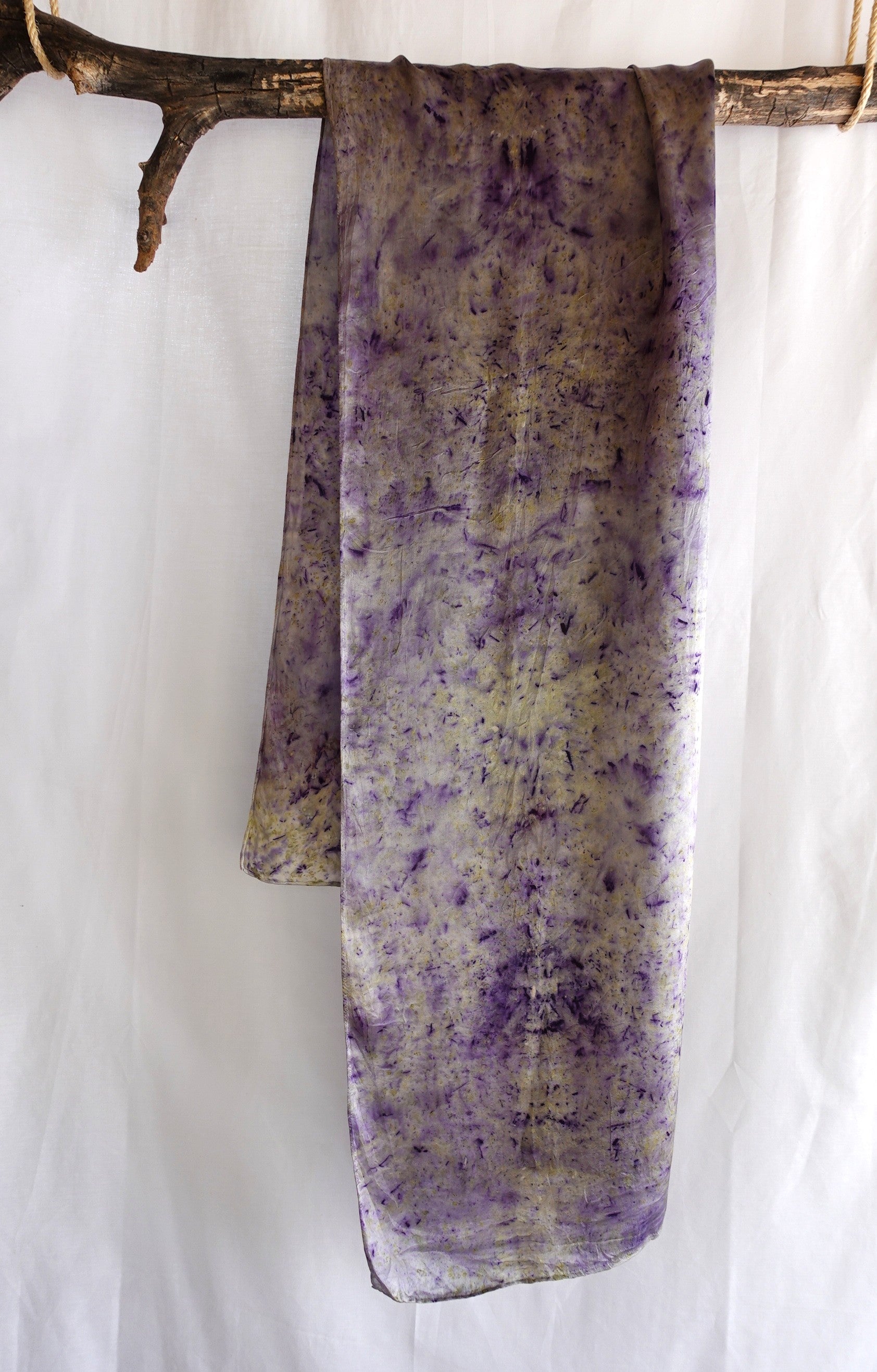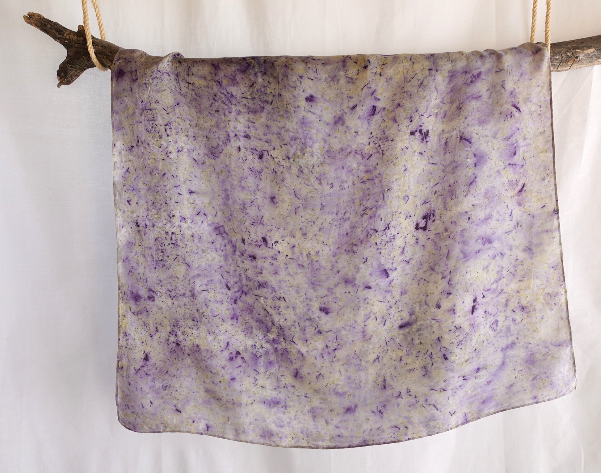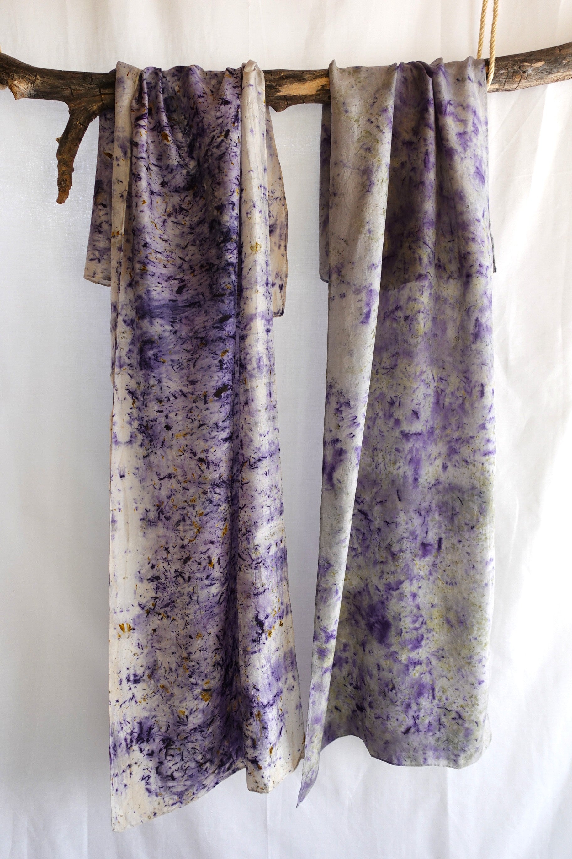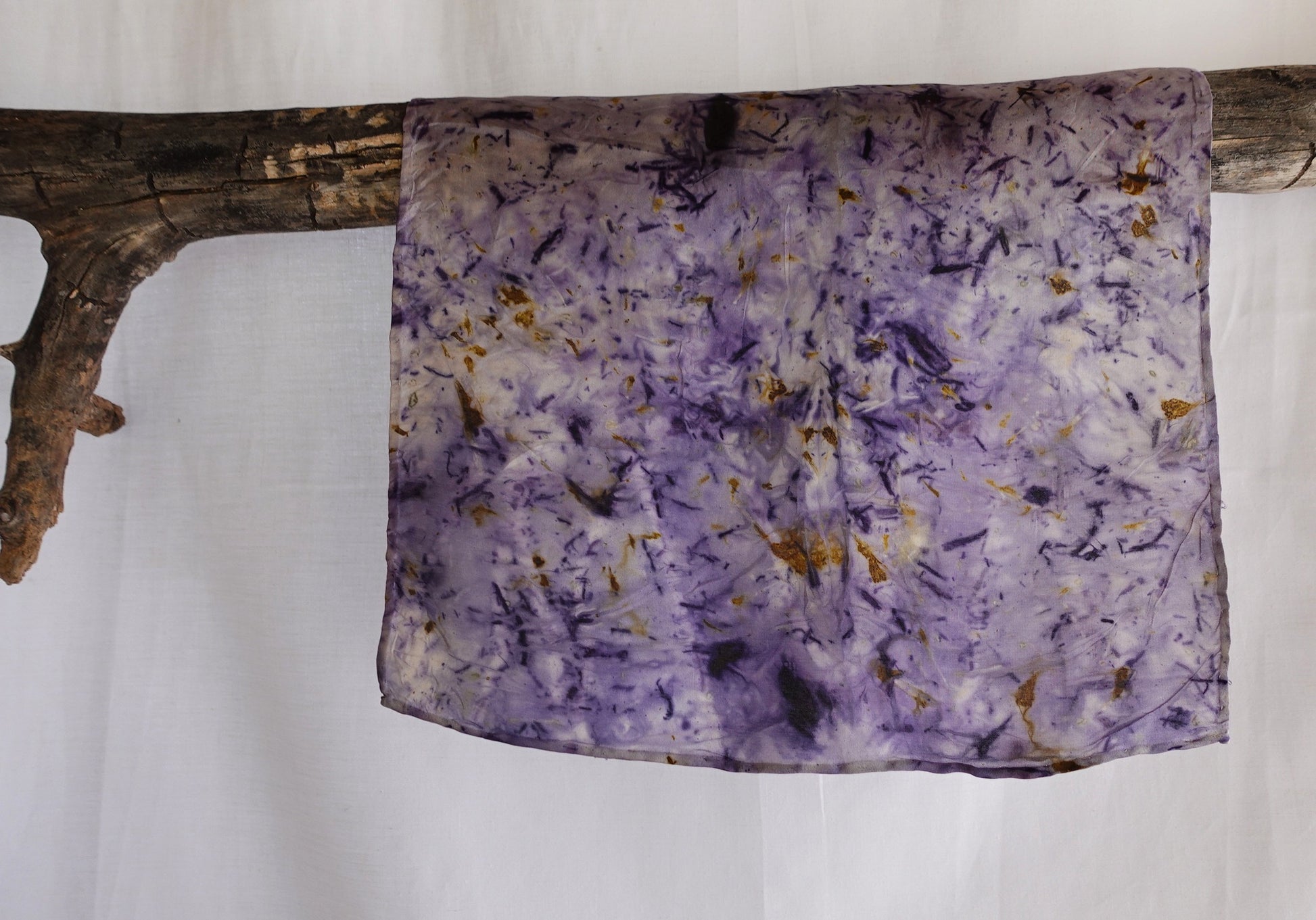 Cada pañuelo es tratado a mano utilizando elementos naturales, creando patrones únicos que capturan la esencia de la naturaleza. La seda, conocida por su suavidad excepcional y su tacto delicado, hace que este accesorio sea ideal para complementar cualquier estilo de manera original.