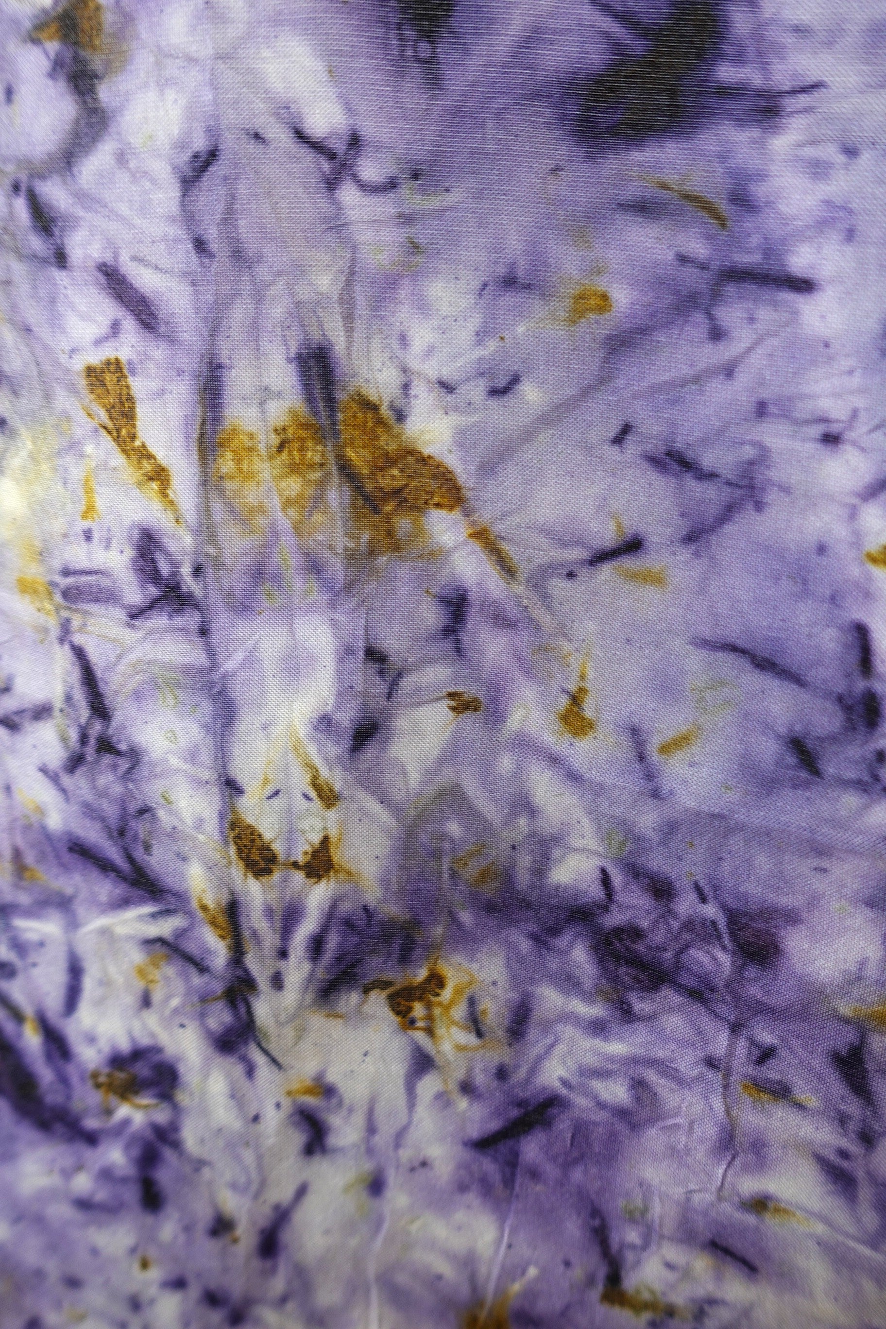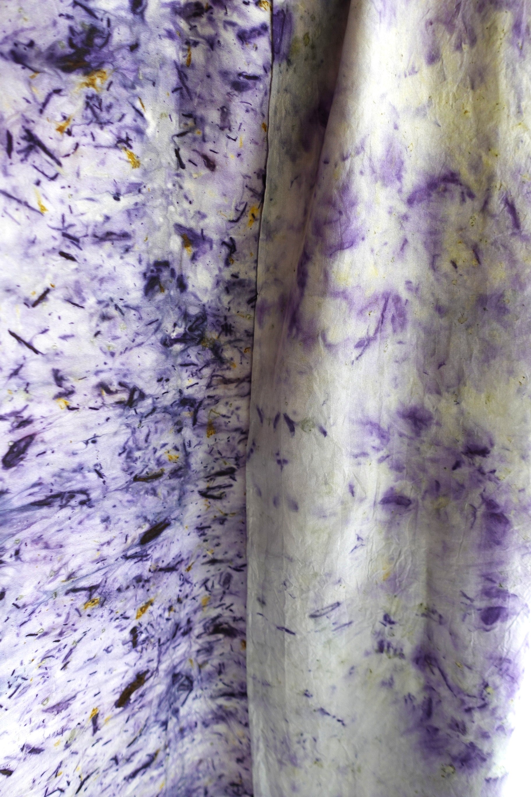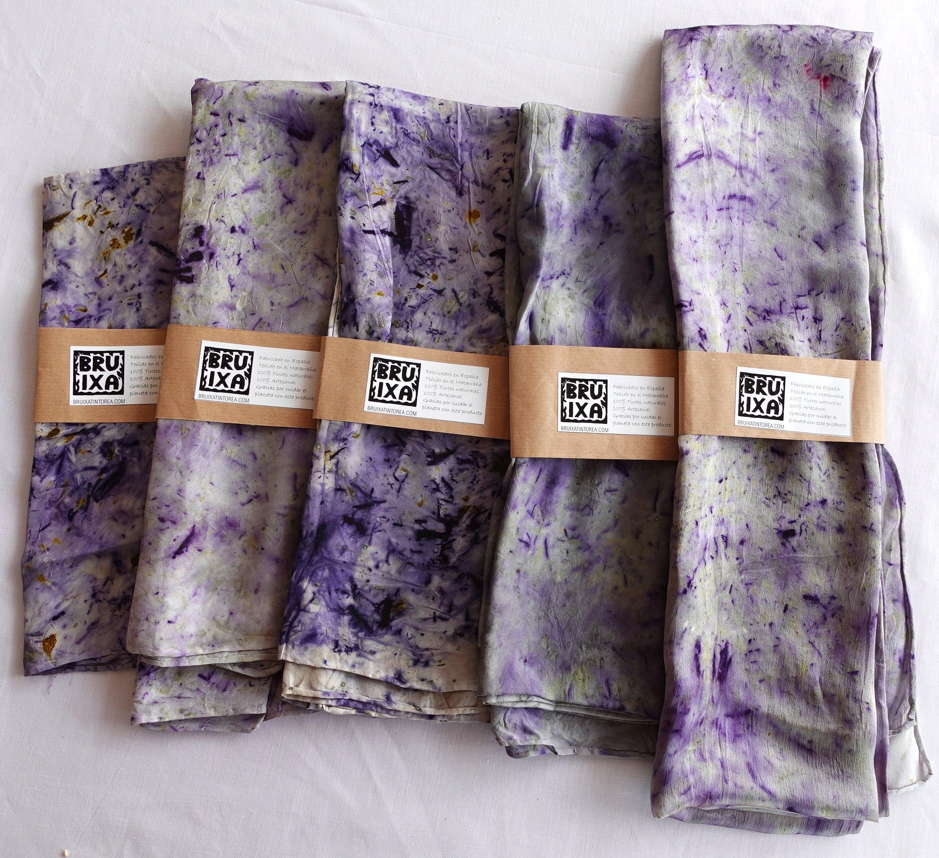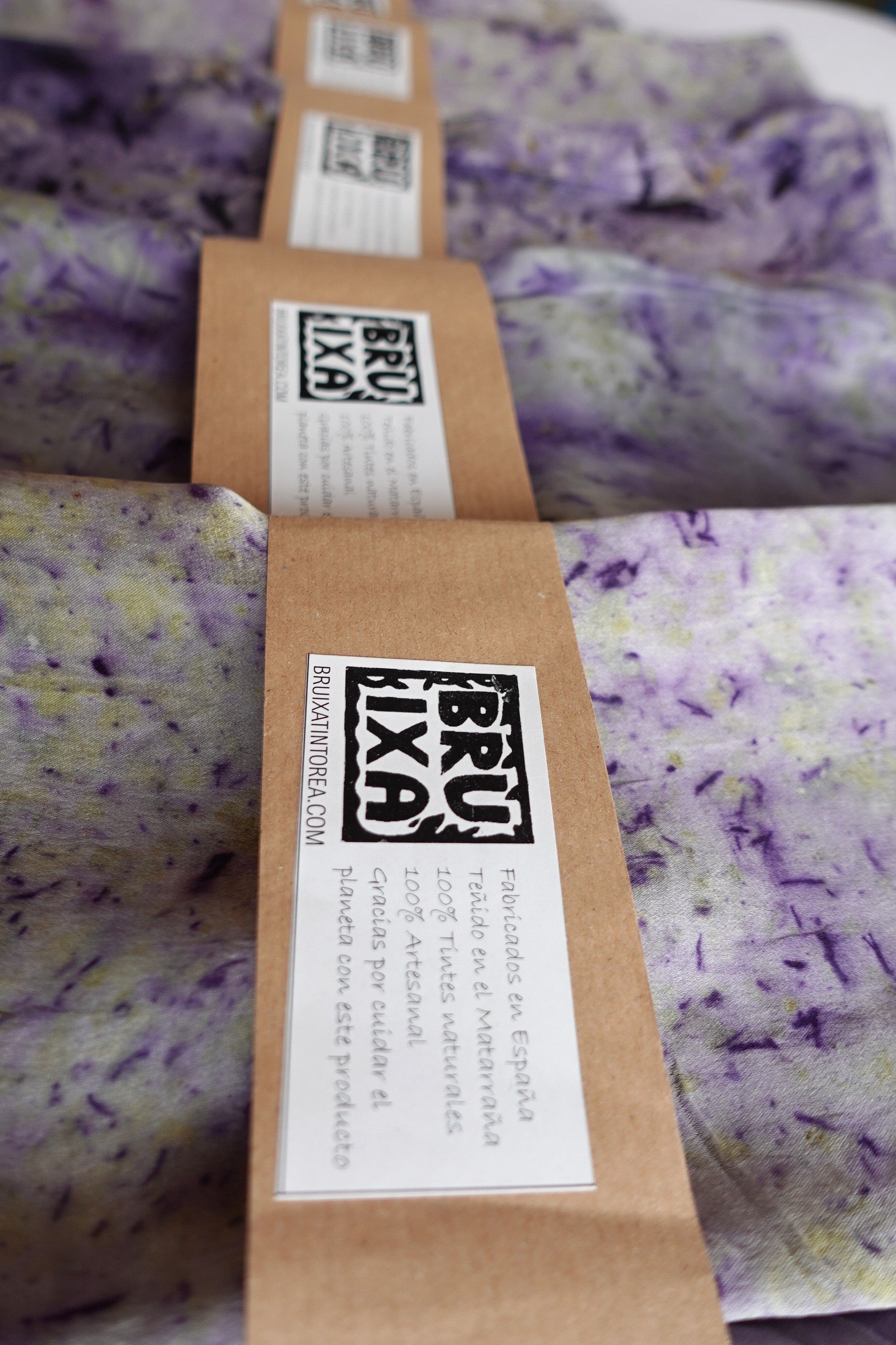 - Técnica: Teñido a mano con elementos naturales (eco print)
