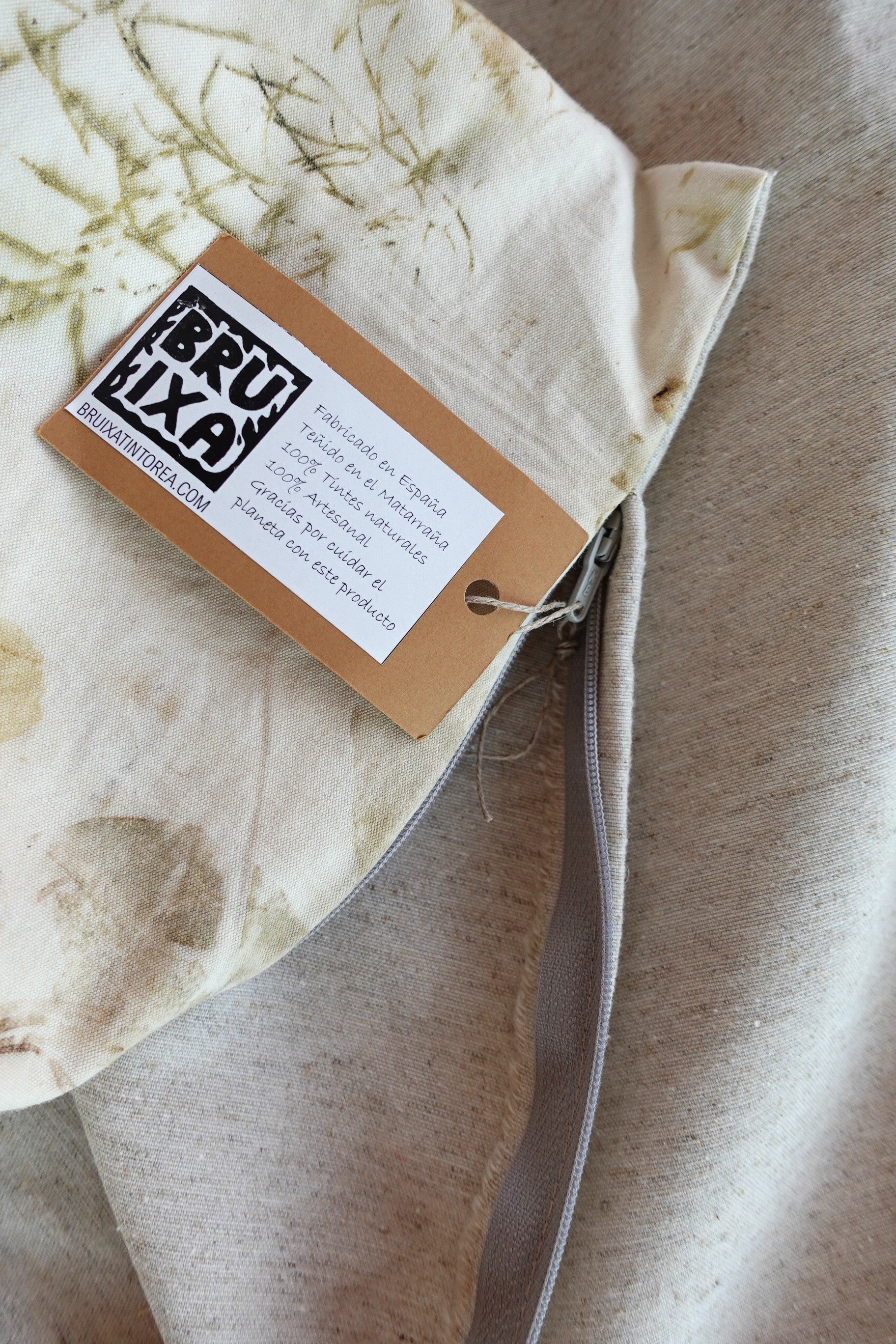 Las fundas de cojines Meiga están elaboradas con tintes naturales sobre loneta de algodón orgánico de alta calidad, cultivado y confeccionado en España.