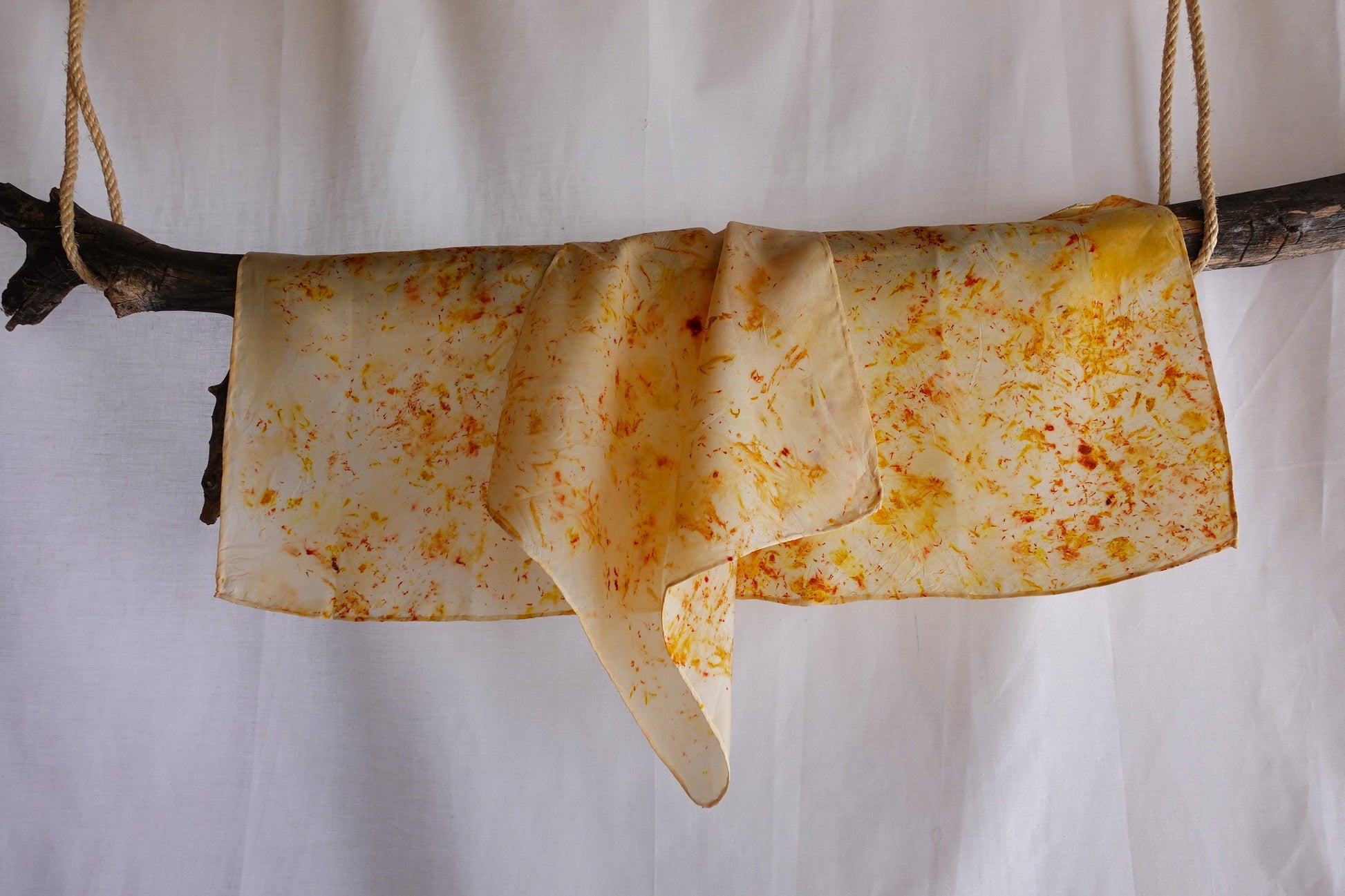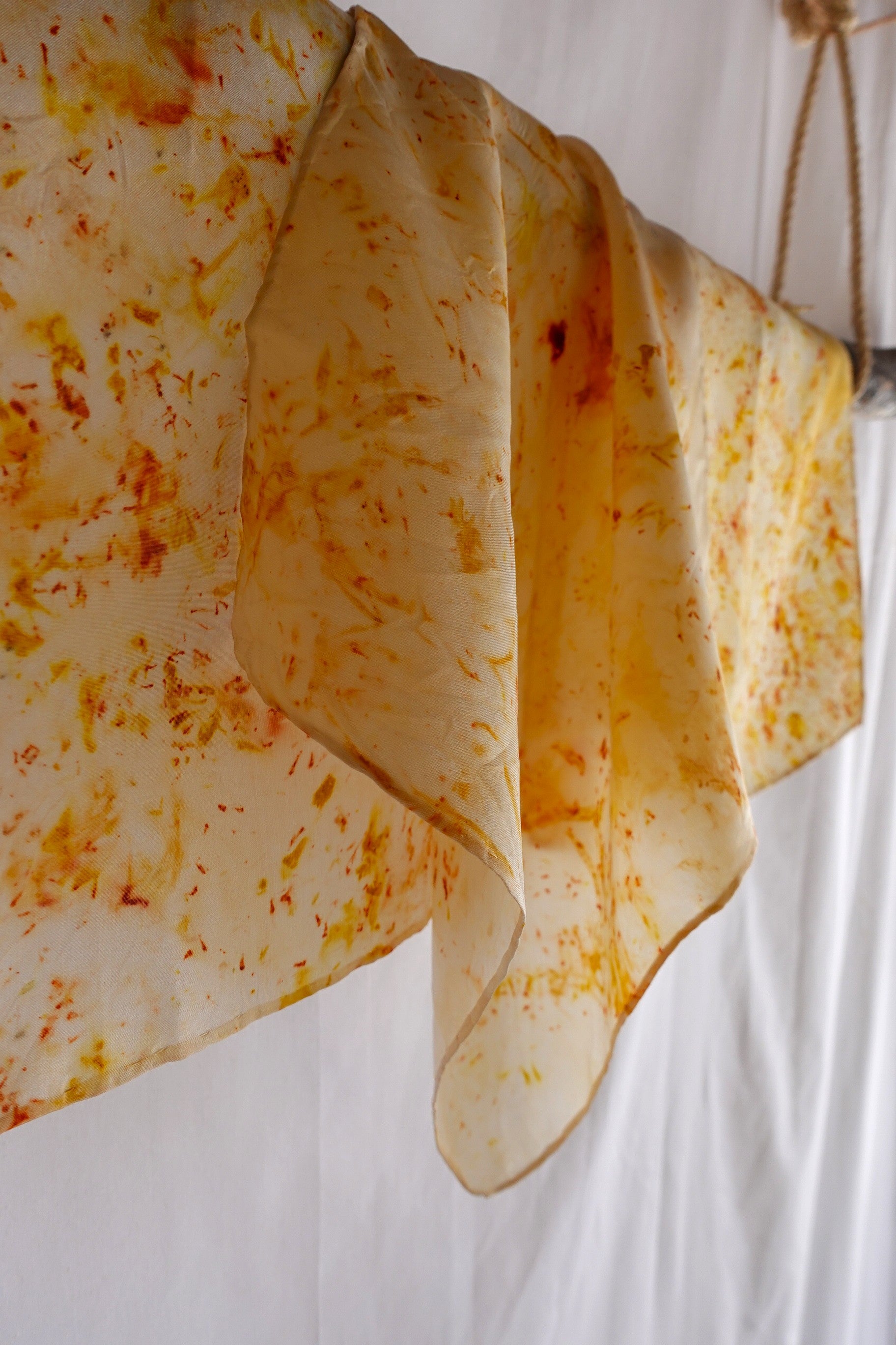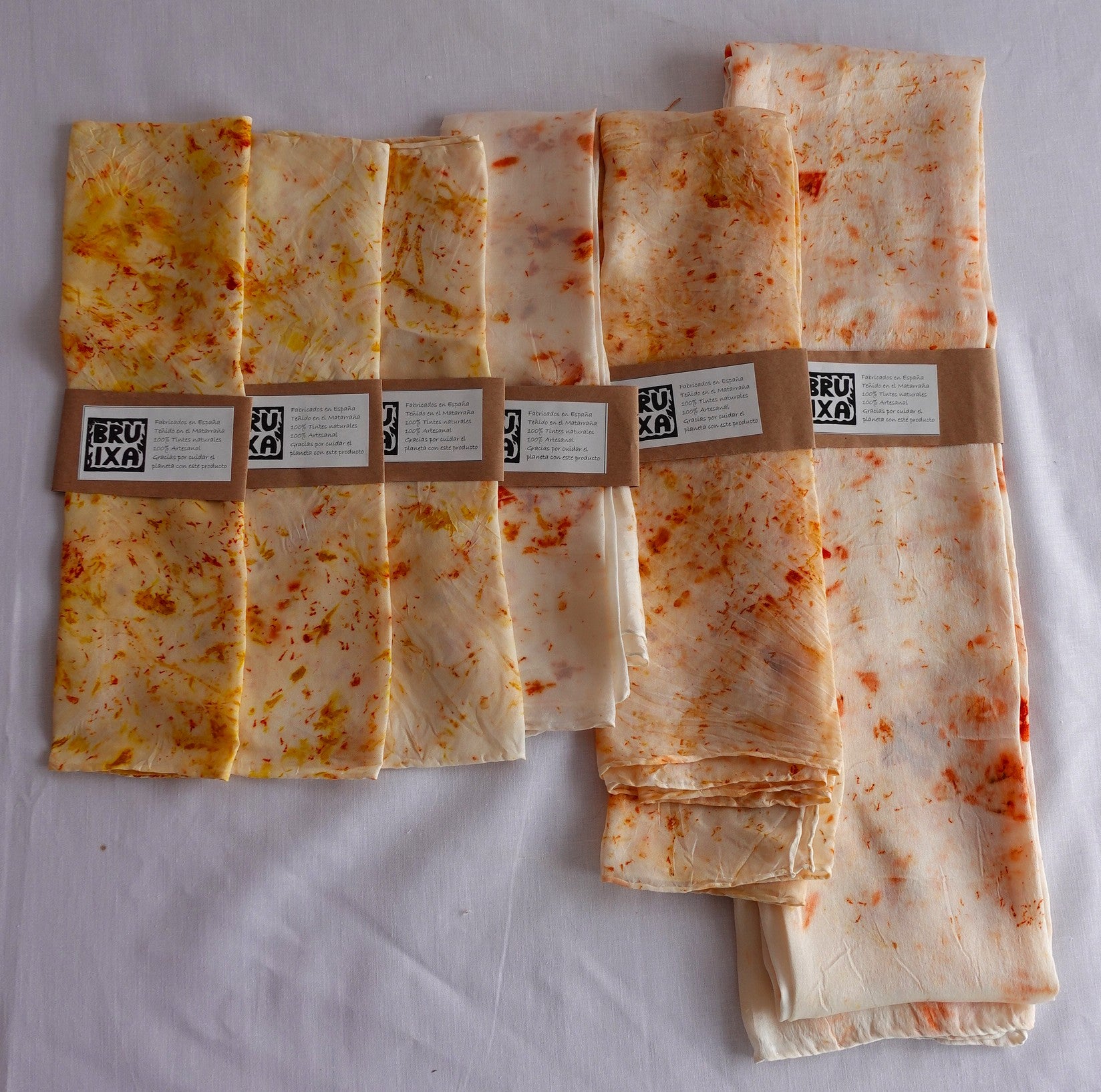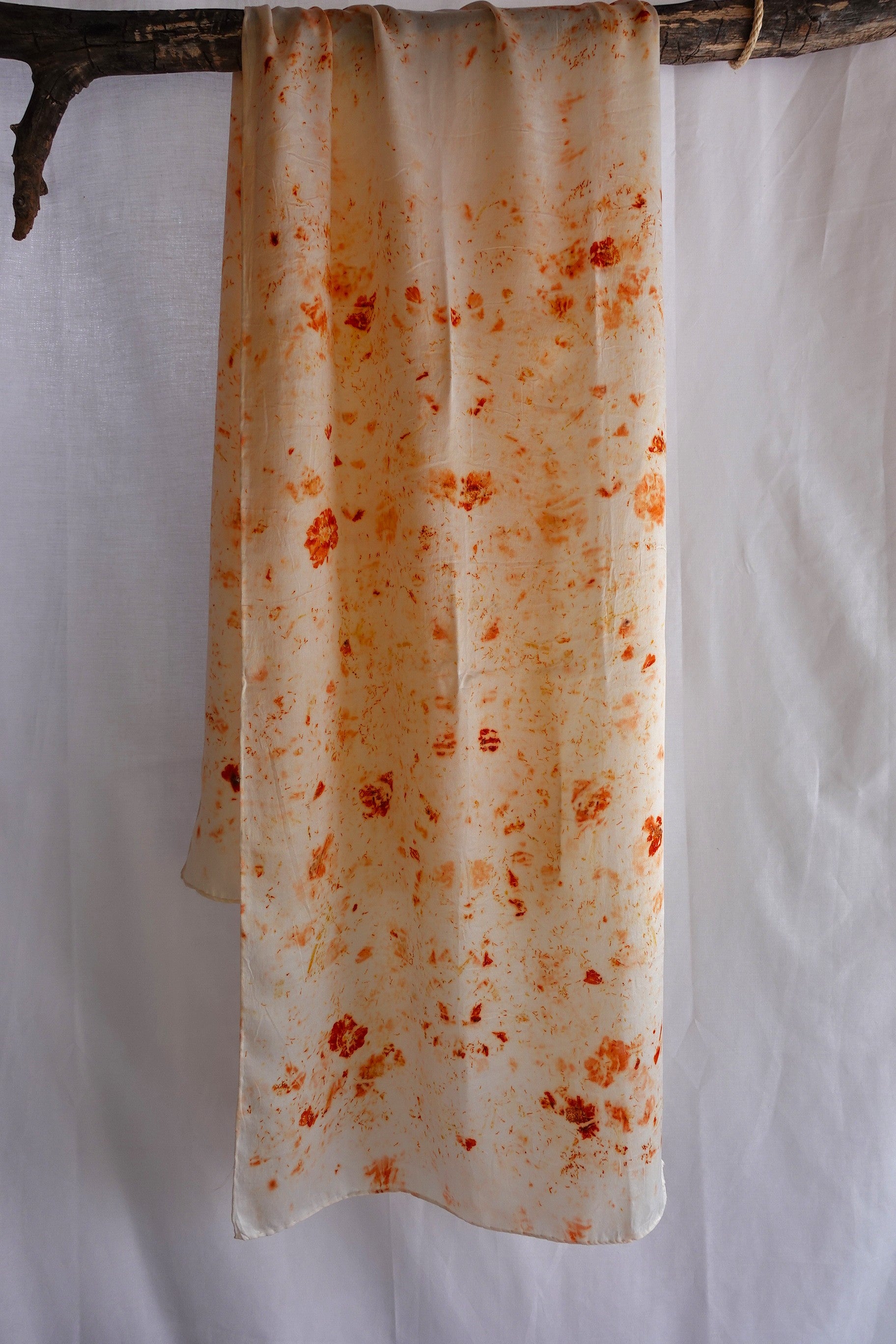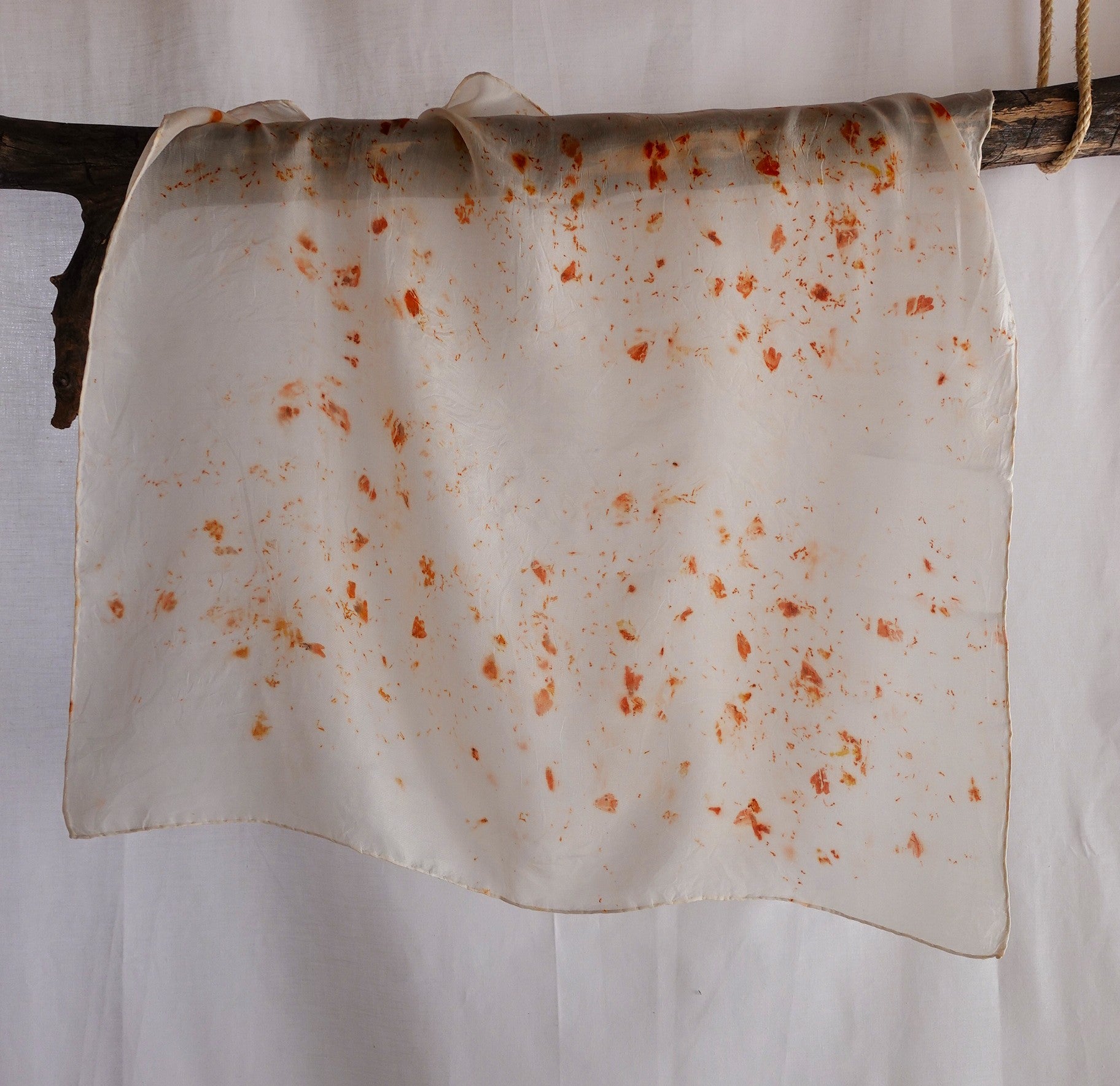 Cada pañuelo es tratado a mano utilizando elementos naturales, creando patrones únicos que capturan la esencia de la naturaleza. La seda, conocida por su suavidad excepcional y su tacto delicado, hace que este accesorio sea ideal para complementar cualquier estilo de manera original.