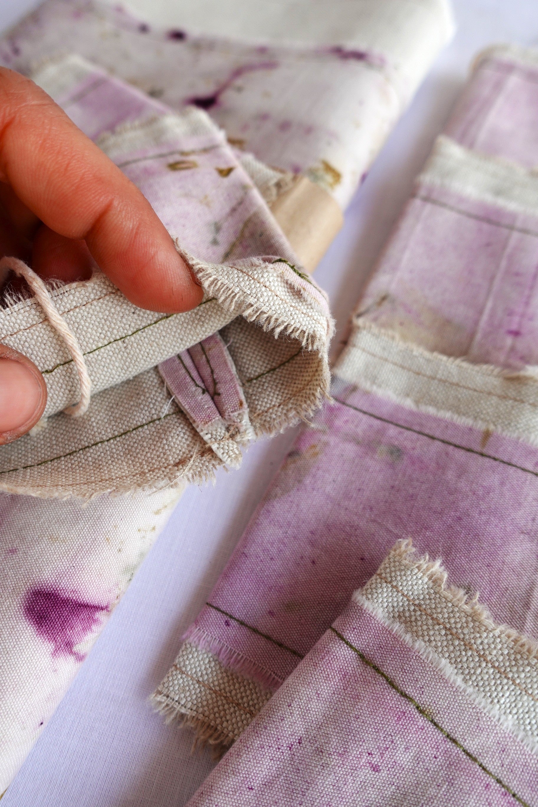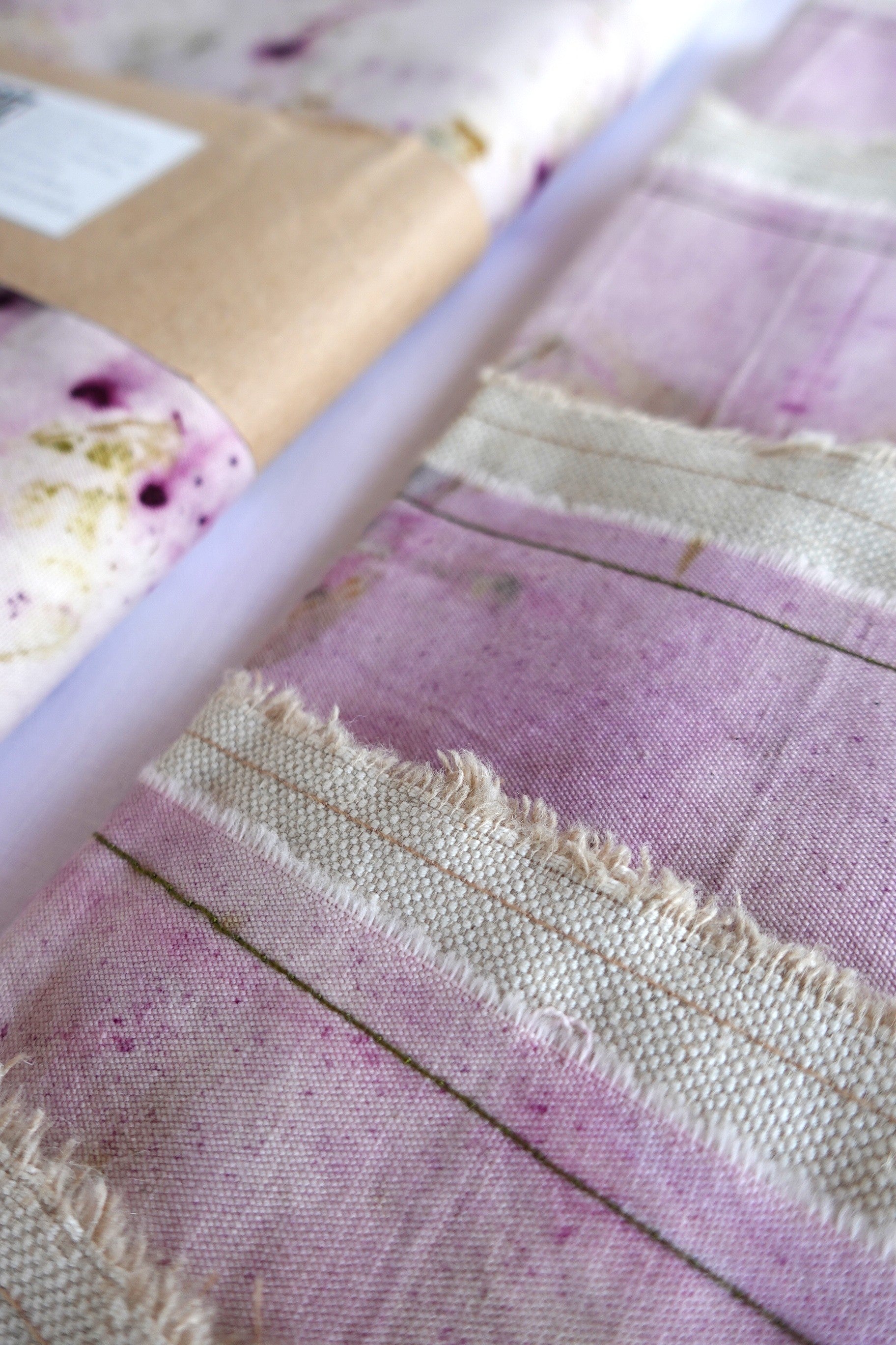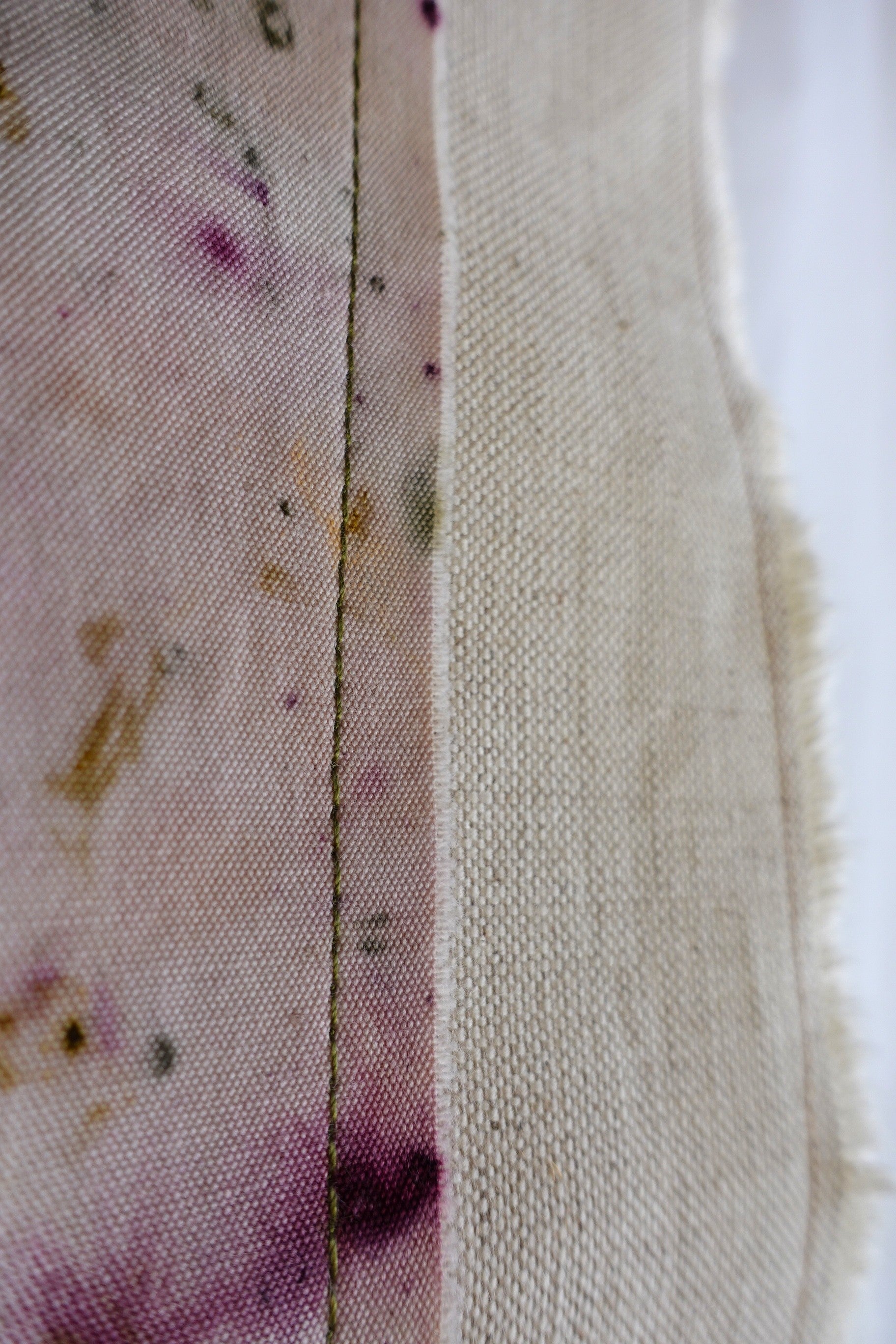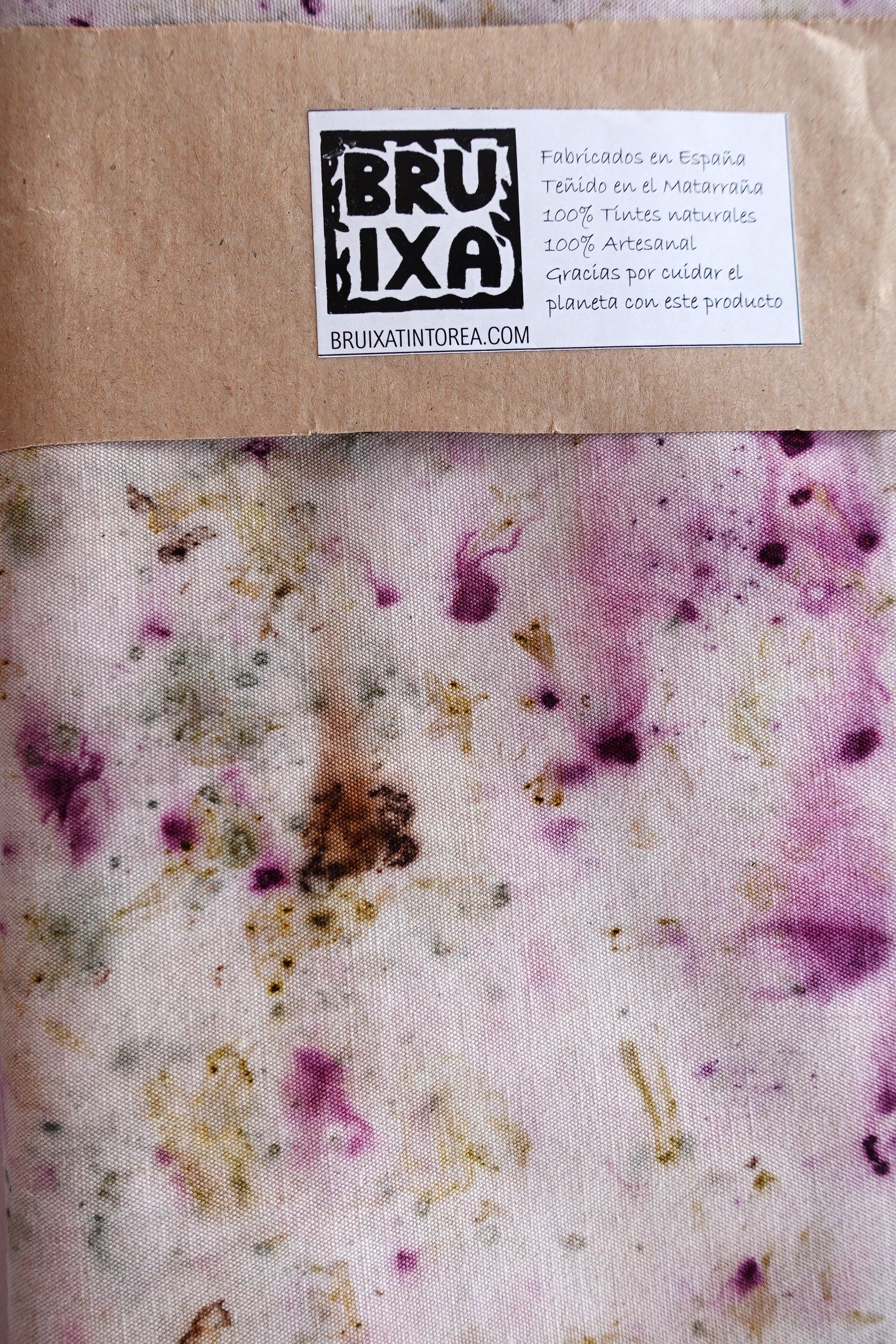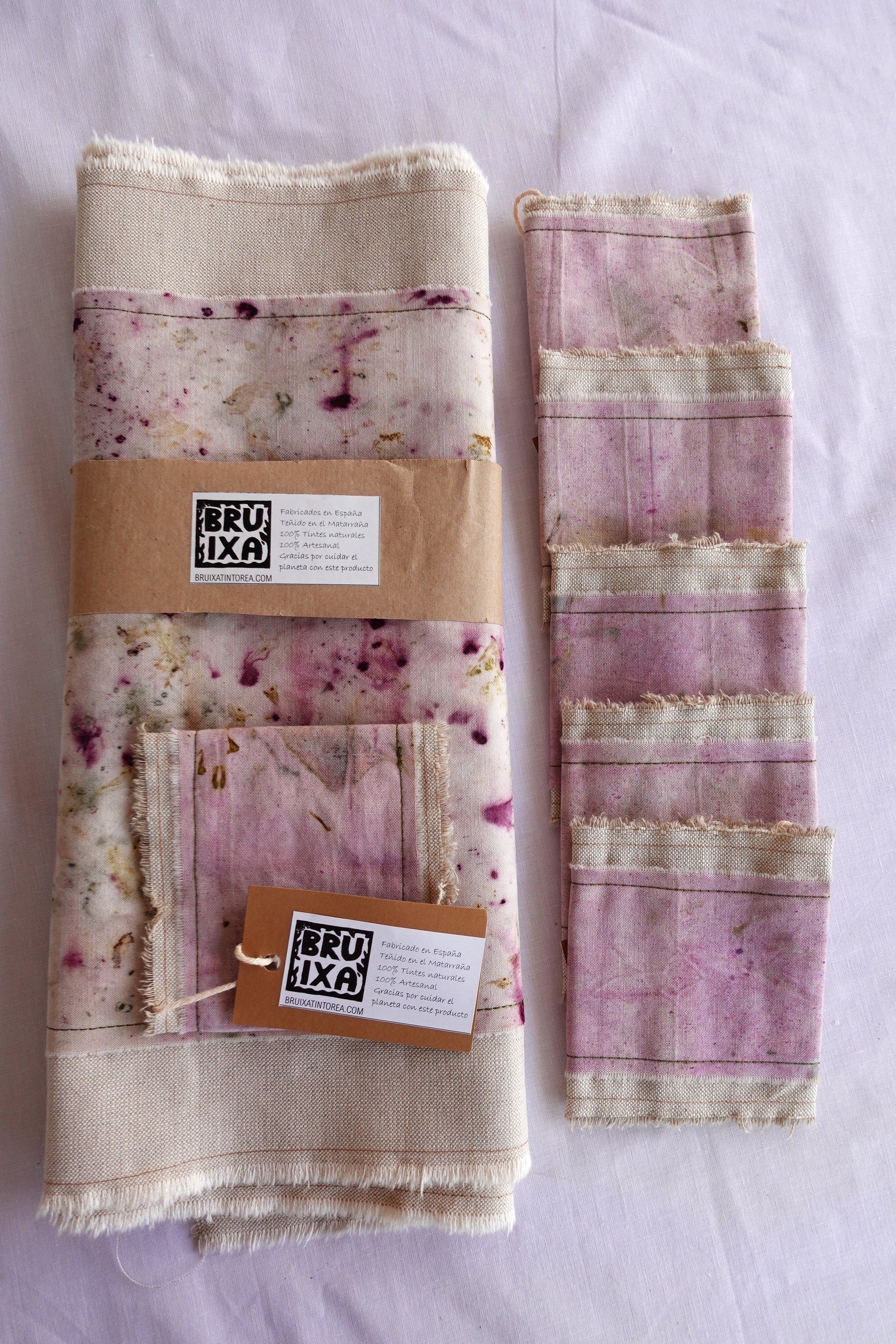 Las colecciones de mantelería de Bruixa Tintórea están realizadas con una loneta teñida con la técnica del ecoprint montada y cosida con un pespunte sencillo sobre una tela de lino.